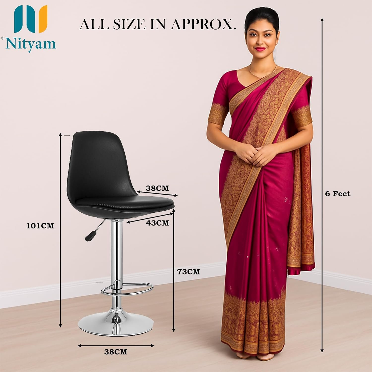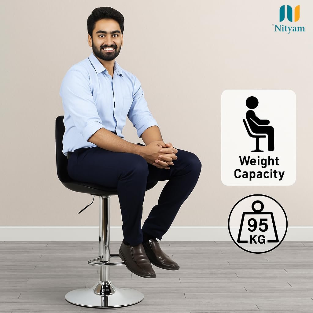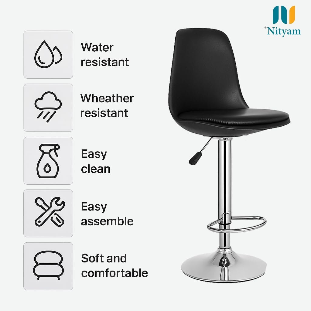Elevate your seating experience with this sophisticated Nityam adjustable bar stool. Featuring a thoughtfully designed ergonomic backrest and generously padded faux leather seat, this stool offers exceptional comfort for extended periods. The robust chrome base provides excellent stability, while the height adjustment mechanism allows customisation from 73 to 101 centimetres to suit various counter heights. With dimensions of 38 cm width and 43 cm depth, it offers ample seating space without occupying excessive room. The sleek black upholstery and modern design complement any contemporary décor. This versatile stool boasts practical features including water and weather resistance, making it suitable for diverse environments. The easy-clean surface ensures hassle-free maintenance, while the straightforward assembly process saves time and effort. Whether for your home bar, kitchen counter, or workspace, this bar stool combines style, durability, and functionality in one elegant package.