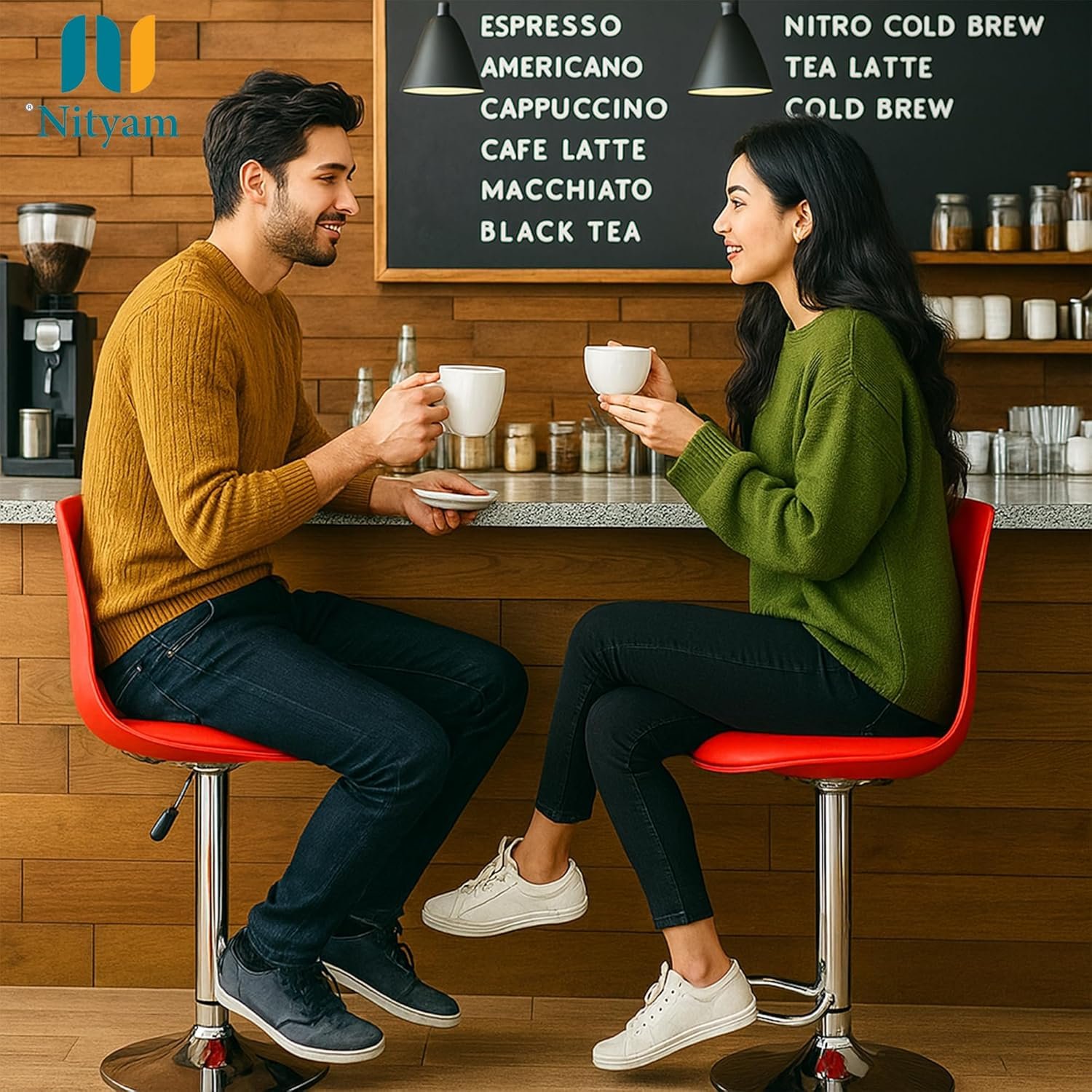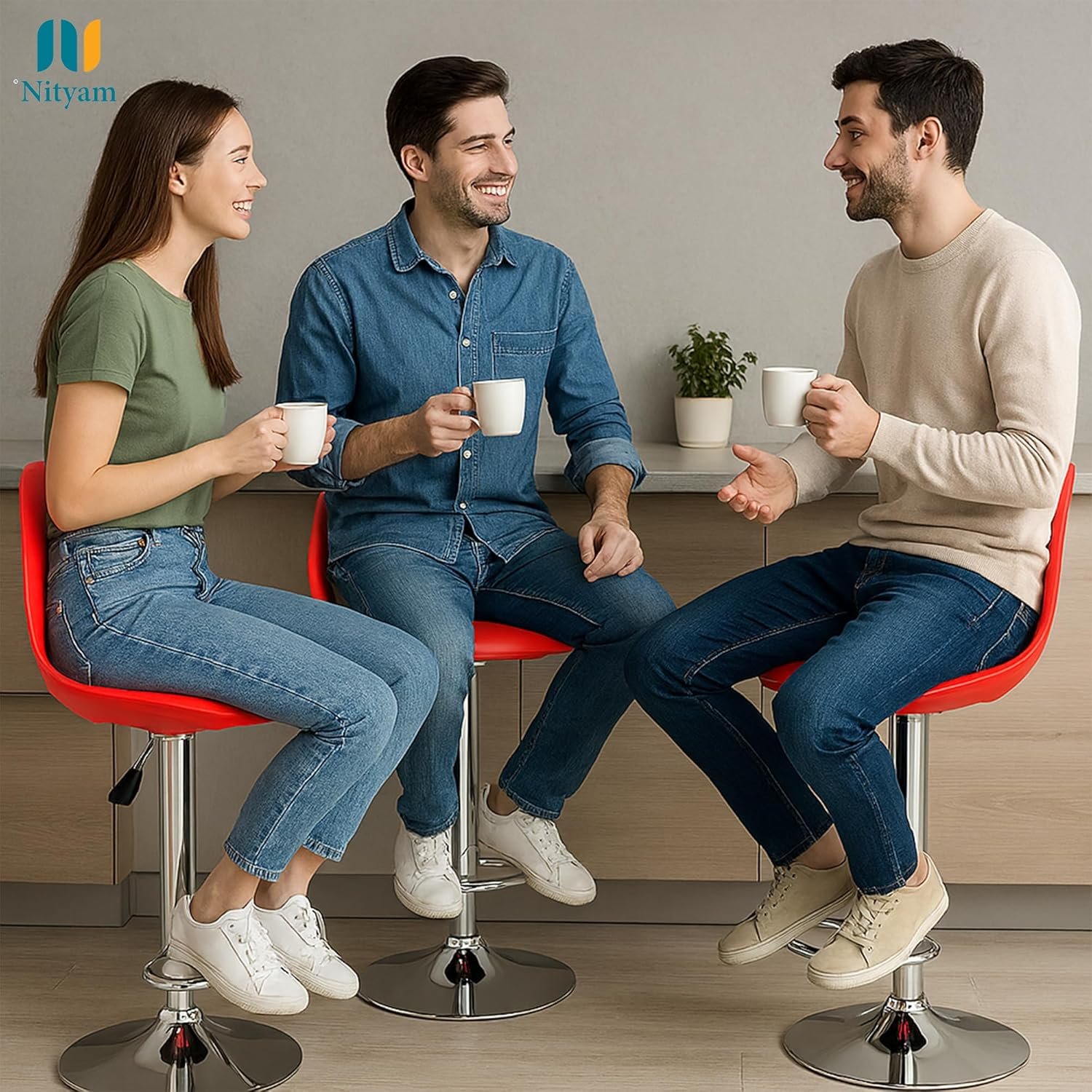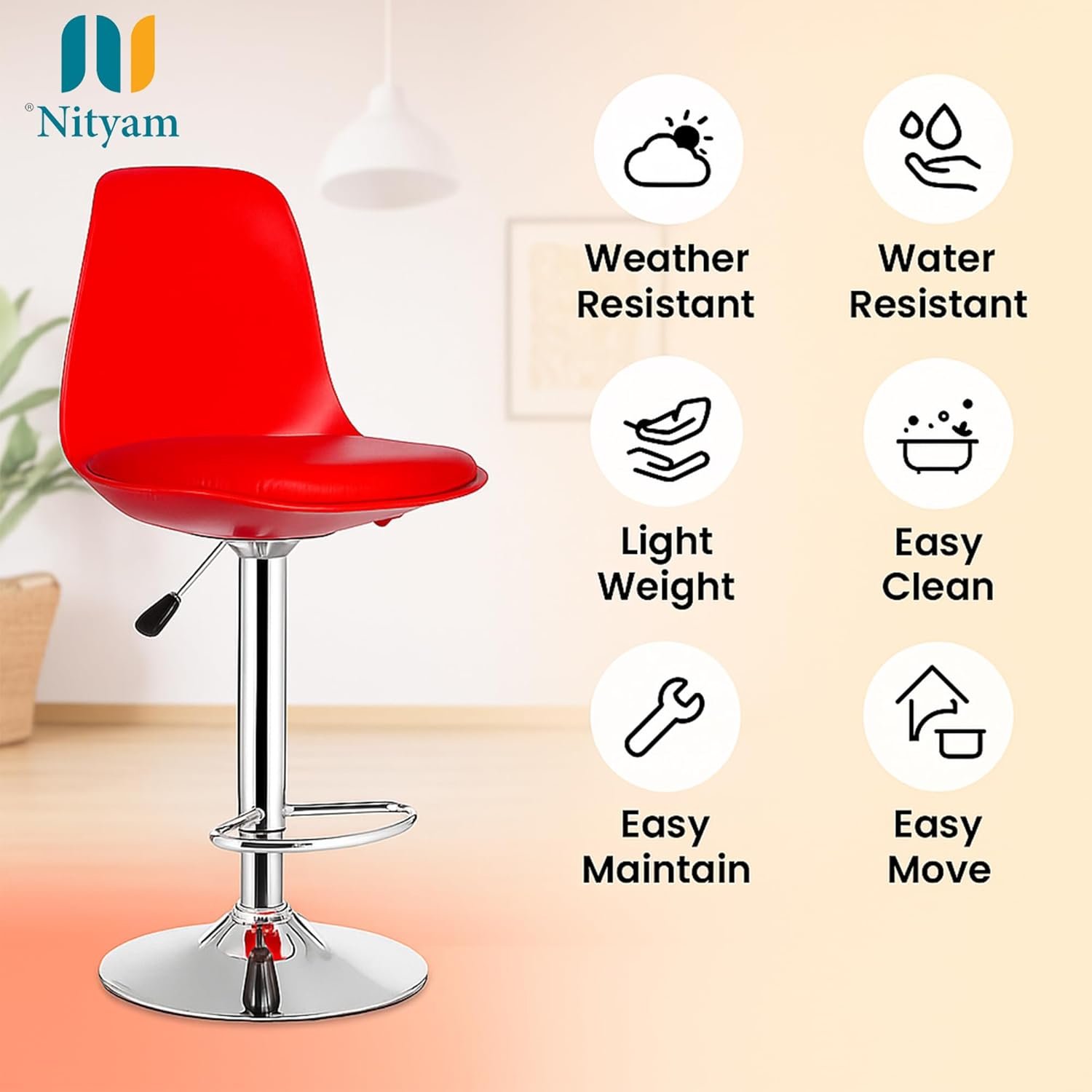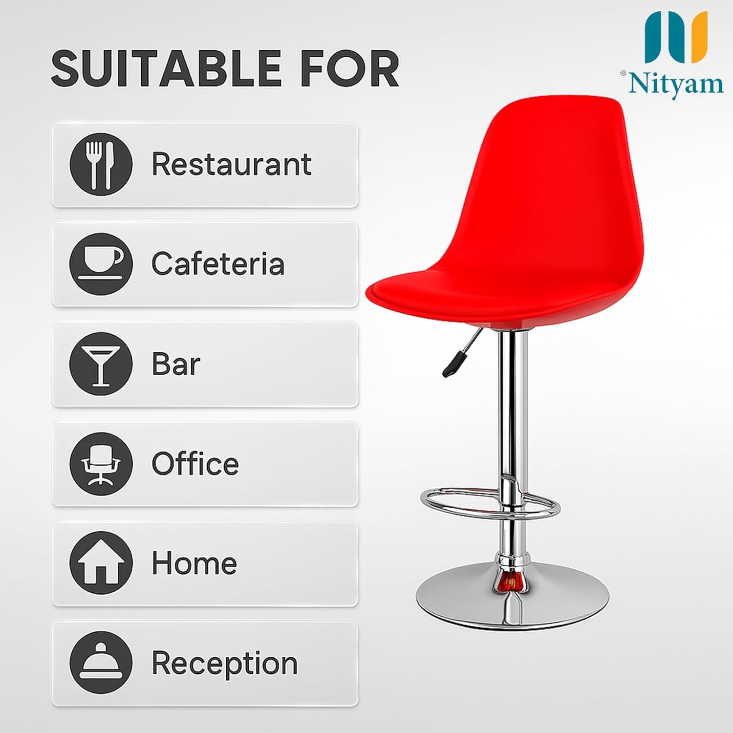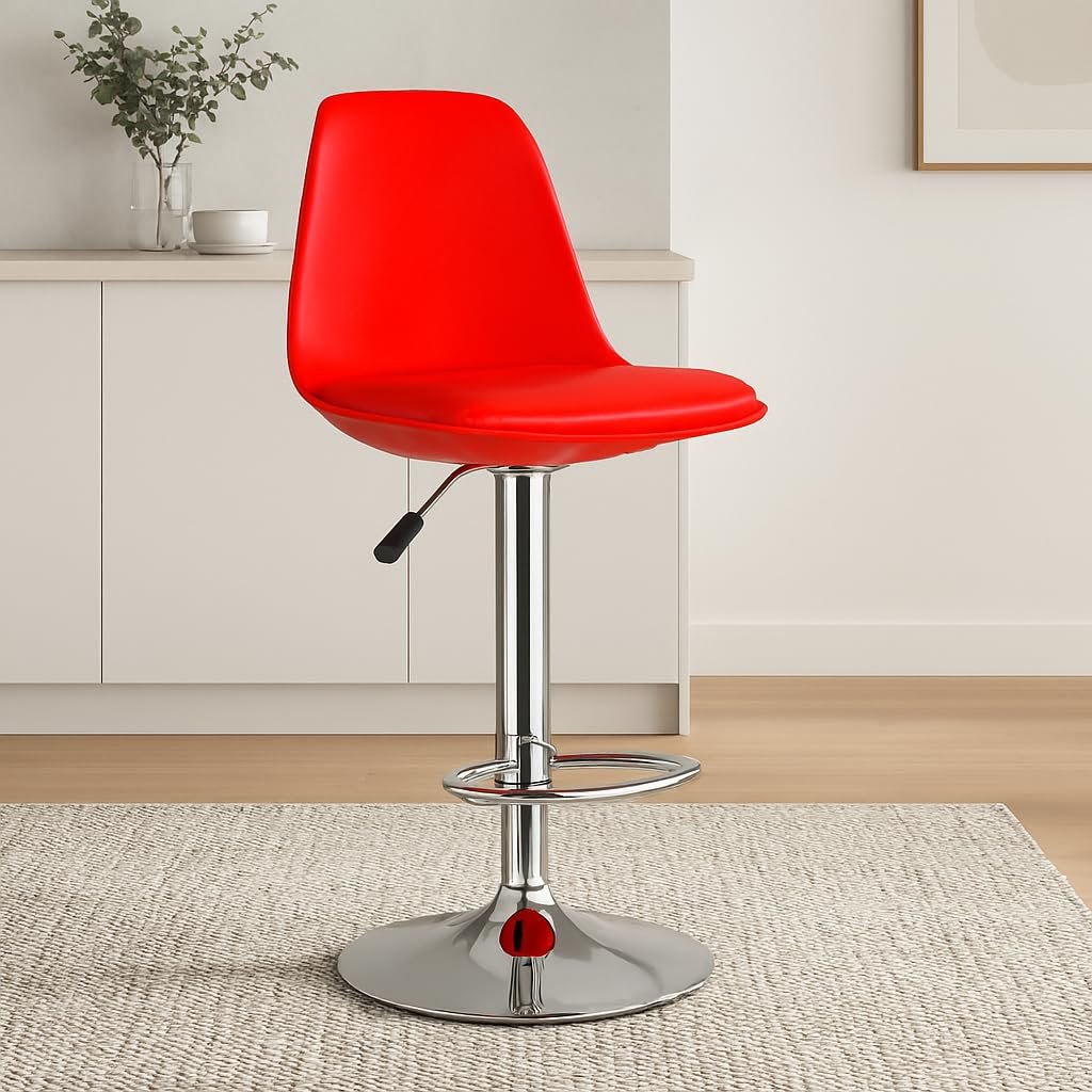 NITYAM- Elevate your space with this versatile adjustable bar stool, perfect for multiple settings including clinic, hospital, kitchen, restaurants, cafeterias, bars, offices, homes, and reception areas. The striking red seat features a soft, comfortable cushioning that provides excellent comfort for extended periods. The height can be easily adjusted from 55 to 81 cm to suit your needs, while the built-in footrest offers additional support and comfort. The stool’s dimensions are thoughtfully designed with a 39.5 cm seat width and 38 cm depth, providing ample seating space. The durable chrome-finished base ensures stability and longevity, while the 360-degree swivel function allows for easy movement. The modern design combines functionality with style, featuring clean lines and a sleek silhouette that complements any décor. Whether you’re furnishing a commercial space or looking for comfortable seating at home, this bar stool delivers both style and practicality. The robust construction supports daily use, while the easy-to-clean surface makes maintenance simple and efficient.
