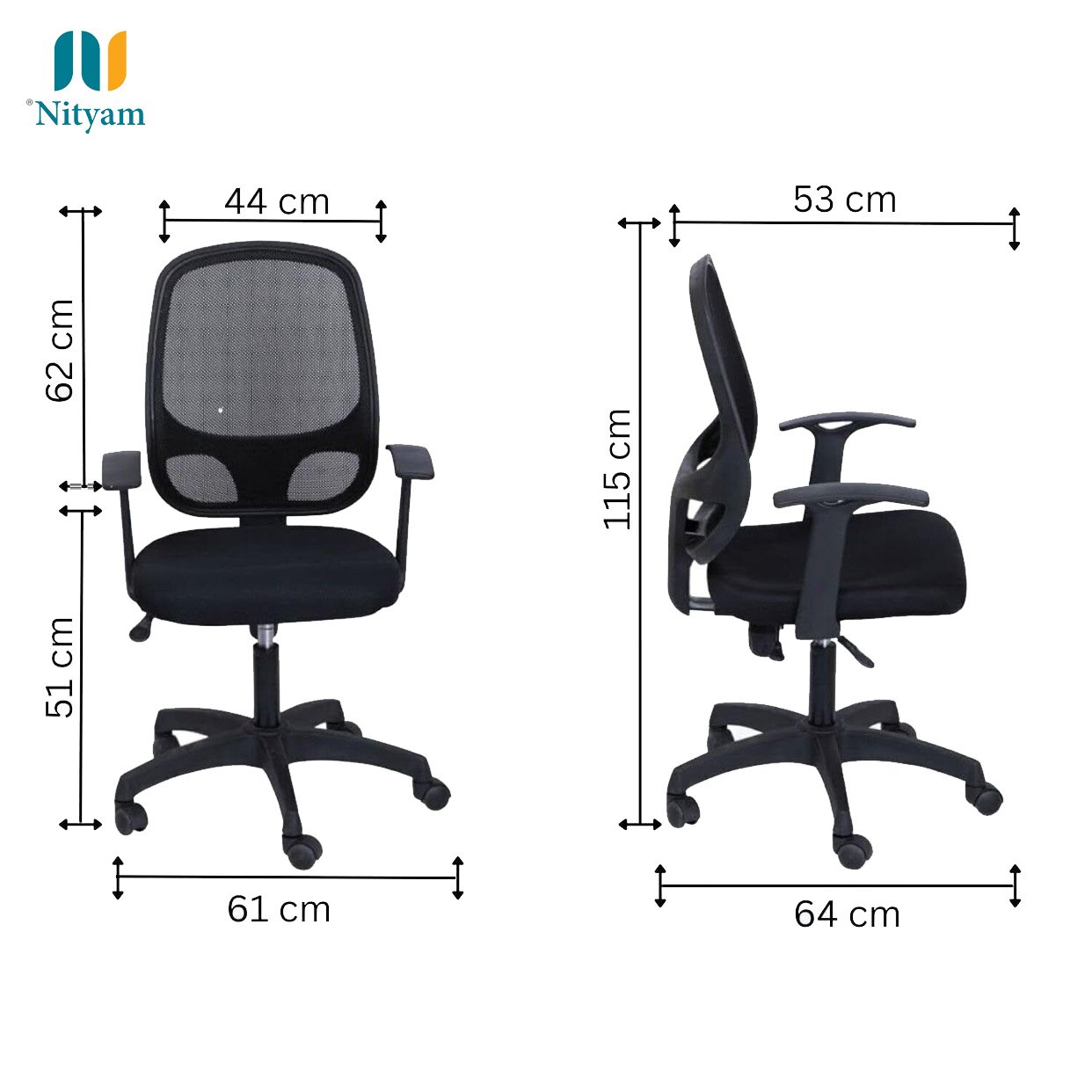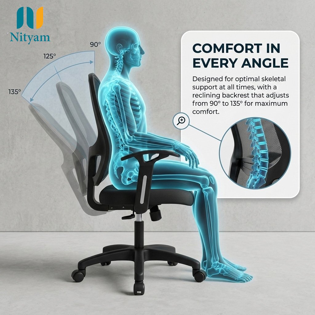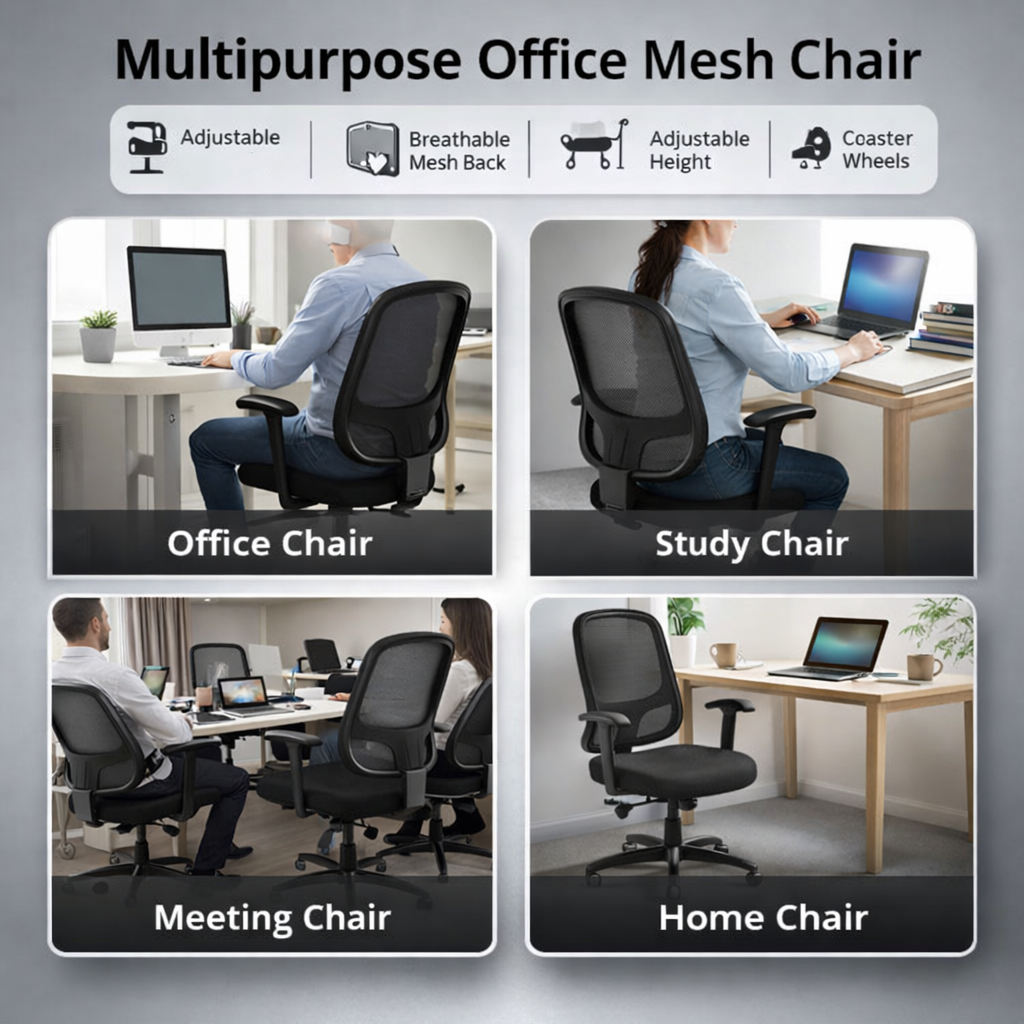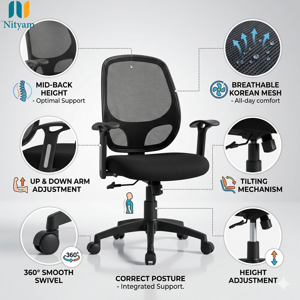 Introducing the Nityam Multipurpose Office Mesh Chair — your ultimate seating solution for long hours of productive work. Engineered for comfort in every angle, this mid-back chair features a reclining backrest that adjusts from 90° to 135°, providing optimal skeletal support throughout the day. The breathable Korean mesh back ensures all-day comfort by promoting excellent air circulation, keeping you cool even during extended work sessions. Designed for versatility, this chair is perfectly suited as an office chair, study chair, meeting chair, or home chair. Key features include up and down arm adjustment, a smooth 360° swivel, a convenient tilting mechanism, and easy height adjustment — all working together to encourage correct posture and integrated spinal support. The sturdy coaster wheels allow effortless movement across your workspace. Whether you are working from home or in a professional office environment, the Nityam Multipurpose Office Mesh Chair delivers the flexibility and ergonomic support you need to stay comfortable and focused all day long.