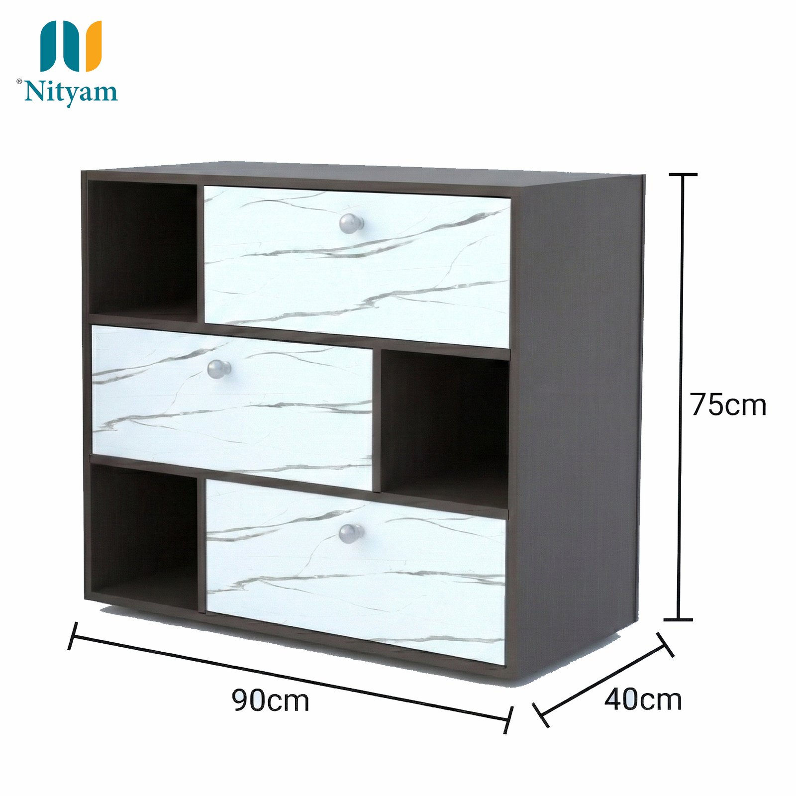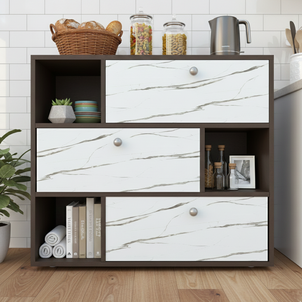 This stylish Nityam kitchen crockery cabinet combines functionality with contemporary design to transform your kitchen storage. Featuring a sophisticated brown frame with elegant white marble-patterned drawer fronts, this versatile storage unit brings both organisation and aesthetic appeal to your space. The cabinet measures 90x75x40 cm, providing ample storage capacity whilst maintaining a compact footprint perfect for modern kitchens. Its thoughtfully designed layout includes three spacious drawers with smooth-gliding mechanisms and sleek round knobs, complemented by multiple open shelving compartments that offer easy access to frequently used items. The alternating arrangement of closed drawers and open cubbies creates visual interest whilst maximising storage efficiency. Display your favourite crockery, store kitchen essentials, organise cookbooks, or showcase decorative pieces in the open sections, whilst keeping less attractive items neatly concealed behind the drawer fronts. The durable construction ensures long-lasting performance, and the neutral colour scheme effortlessly complements various kitchen décors. Whether you’re looking to declutter your countertops, create an organised pantry space, or simply add a touch of sophistication to your kitchen, this multifunctional cabinet delivers on all fronts. Perfect for storing crockery, utensils, linens, and kitchen accessories in an attractive and accessible manner.