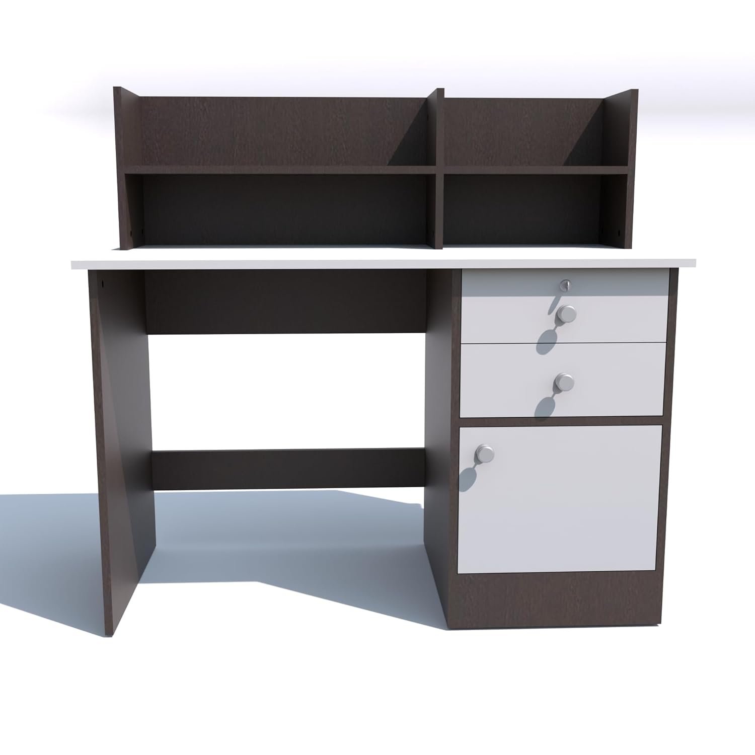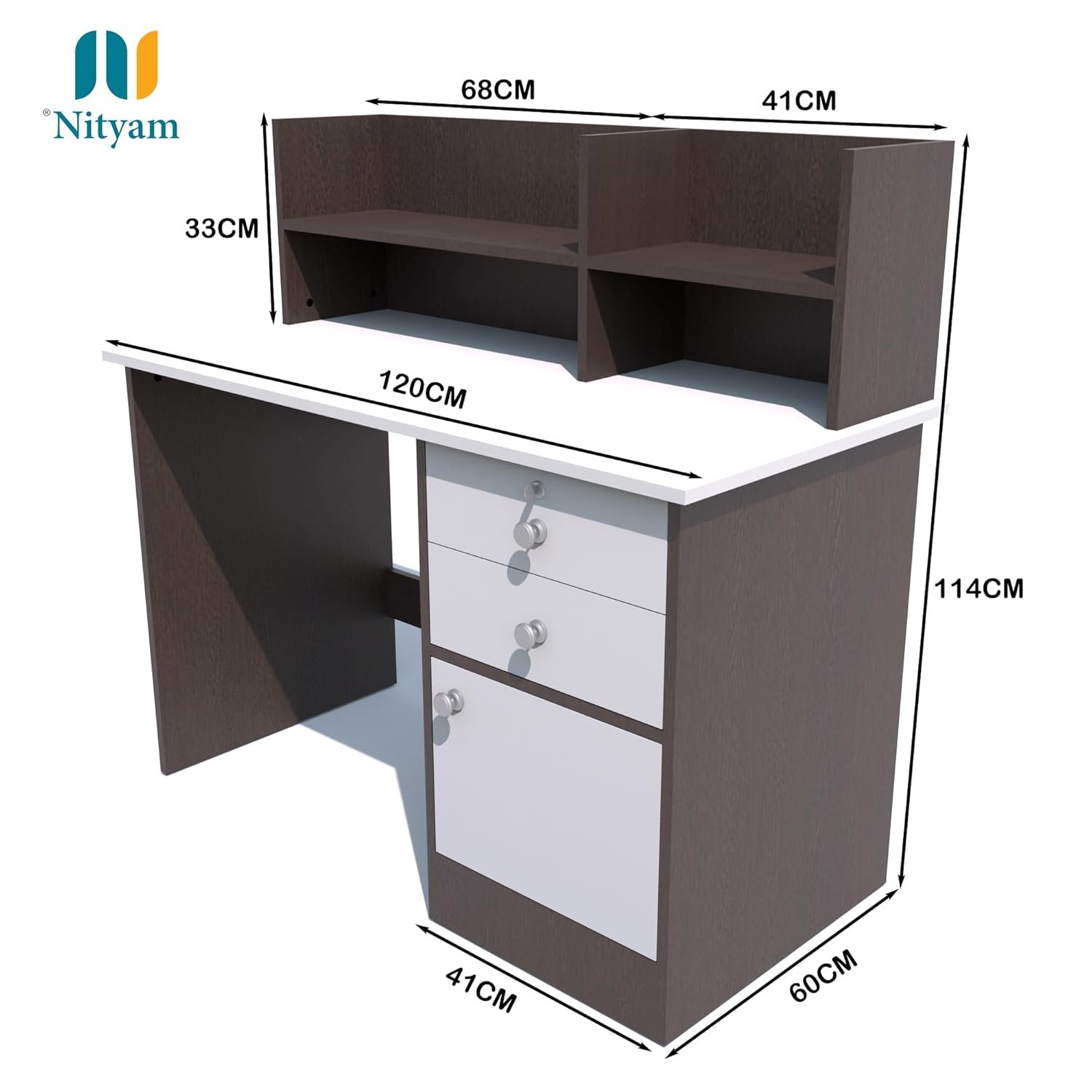 - DIMENSIONS: Overall size 120 cm (W) x 60 cm (D) x 114 cm (H), desktop width 120 cm, hutch dimensions 68 cm x 41 cm x 33 cm, finished in brown and white colour combination