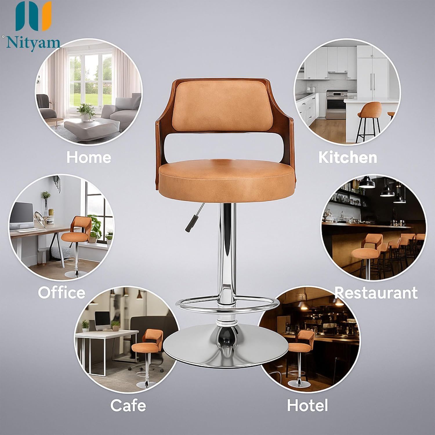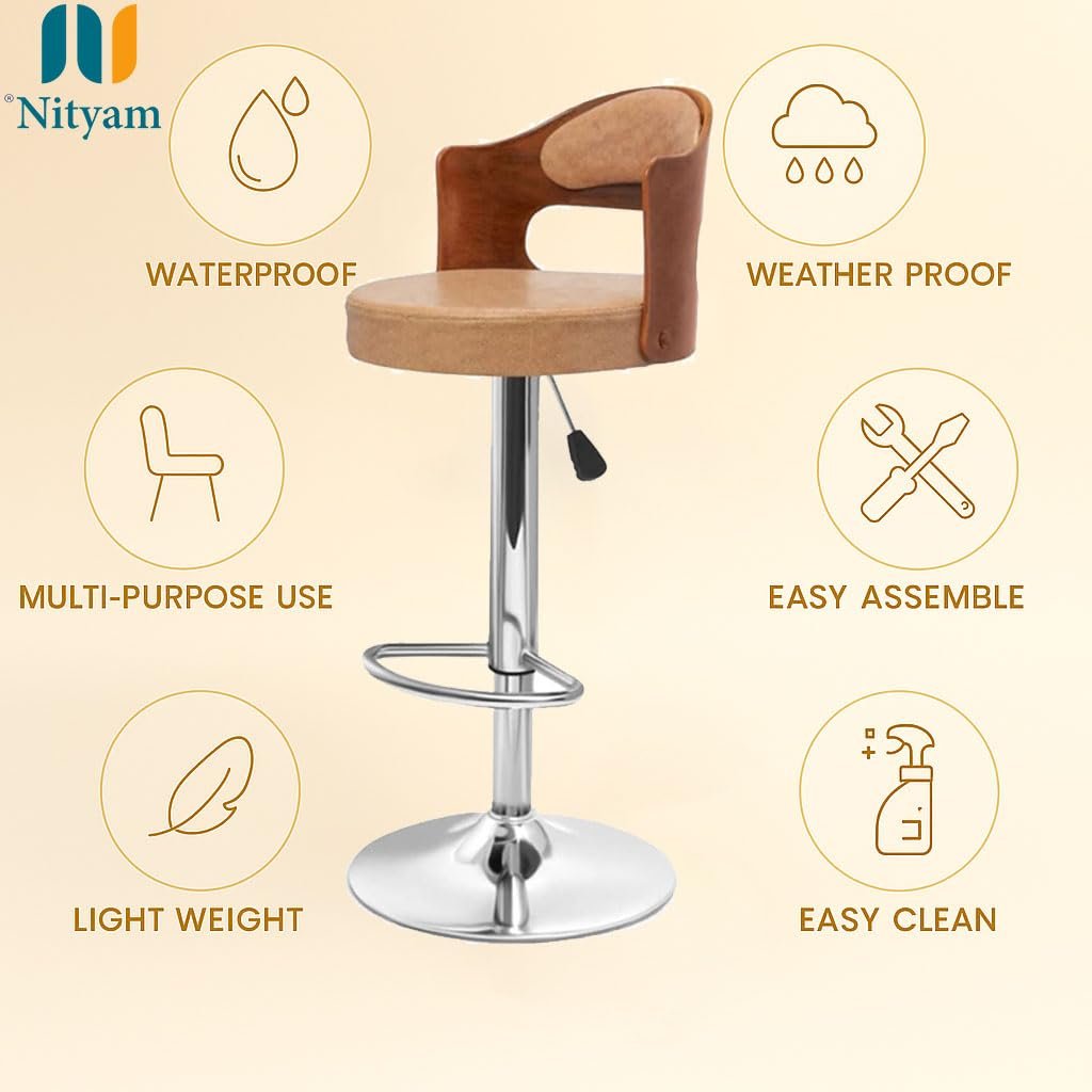 Nityam Height Adjustable Bar Stool Chair for Kitchen, Home, Office, Restaurant, Hote, Brown Faux Leather, Chrome Base, 360? Swivel, (Color-Brown)