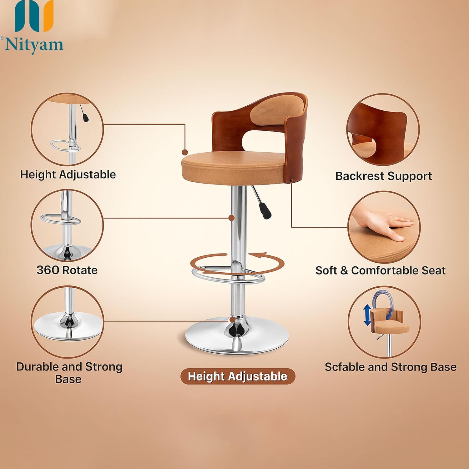 NITYAM Seating Bar Stool Chair for Kitchen| Office| Home| Bar| Restaurant | Shop | Counter, Round Shape Cushion with Backrest, Adjustable Height, 360? Swivel (Color-Beige & Brown, Set of 2)