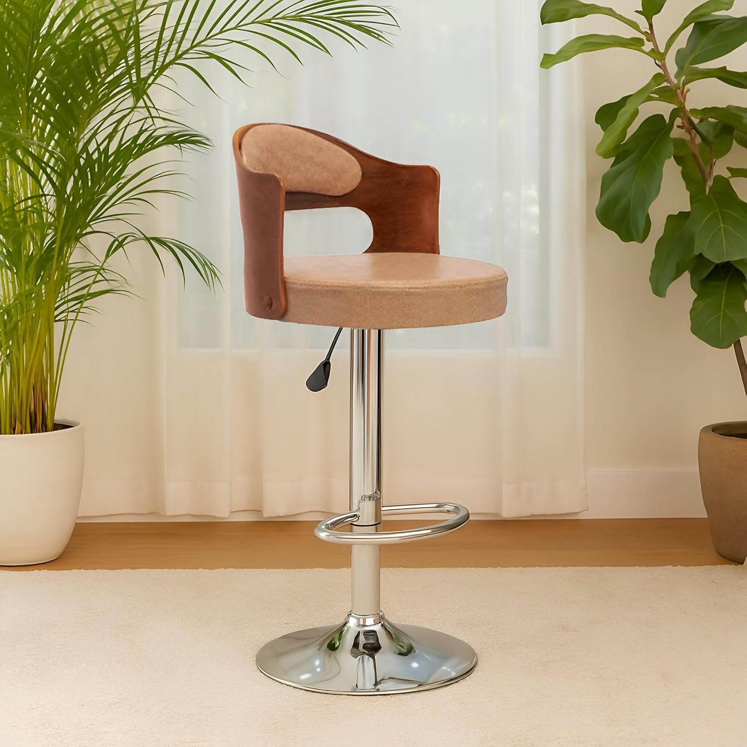 Nityam Furniture Elevate your seating experience with this versatile Nityam bar stool, perfect for any modern setting. The thoughtfully designed stool features a comfortable backrest and plush cushioned seat that ensures optimal comfort during extended periods of use. Its premium chrome base provides exceptional stability, while the 360-degree swivel functionality offers seamless mobility. The height-adjustable mechanism allows you to customise the seat position from 82.5 cm to 102.9 cm, making it suitable for various counter heights. With a seat width of 40.6 cm and depth of 27.9 cm, this stool offers ample space while maintaining a sleek profile. The durable construction combines style with functionality, making it an ideal choice for homes, offices, kitchens, cafes, restaurants, and hotels. The ergonomic design, featuring an integrated footrest and curved backrest support, ensures proper posture and lasting comfort. This sophisticated bar stool seamlessly blends into any interior décor while providing practical seating solutions for diverse environments.