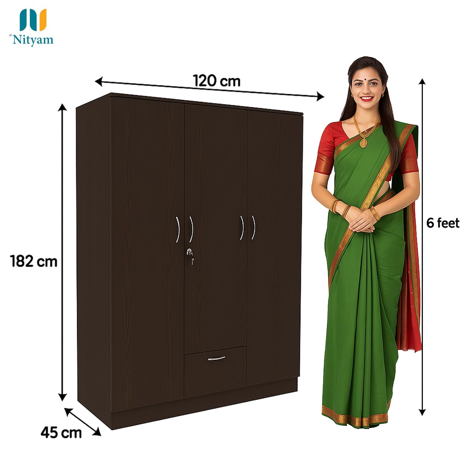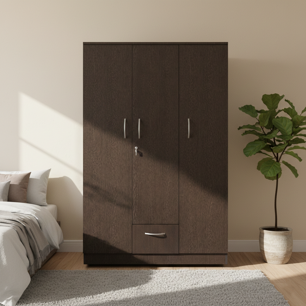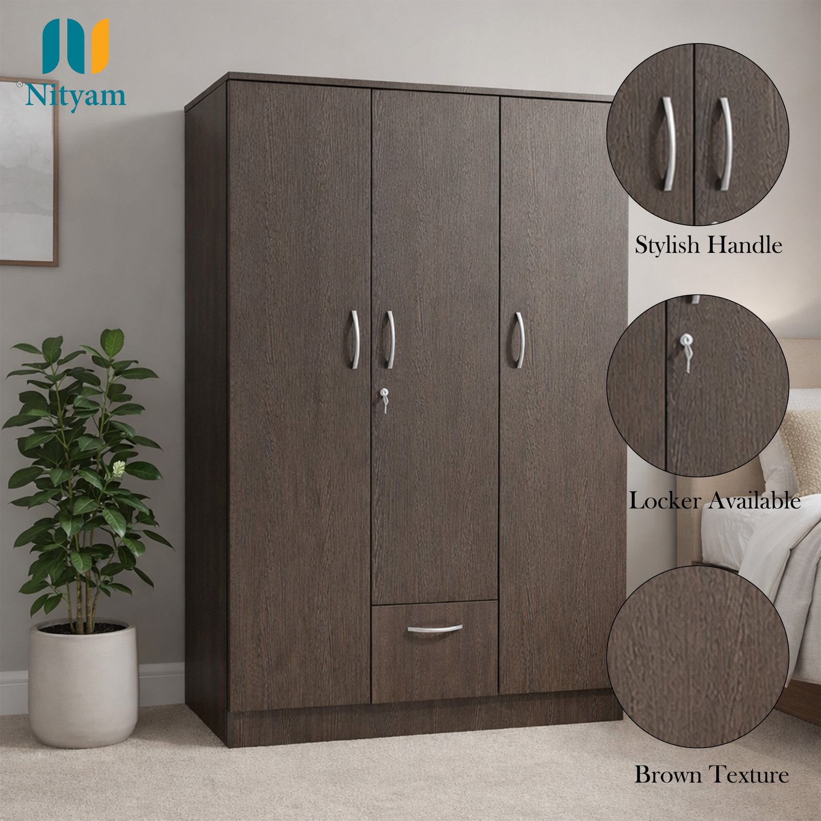 - ✅ Spacious Wooden Wardrobe Organizer: NITYAM Engineered Wood 3 Door wooden Wardrobe / Cupboards / Almirah organizer for storage features 7 Shelves, 1 Locker, & 3 Door, a hinged door and a secure key lock.