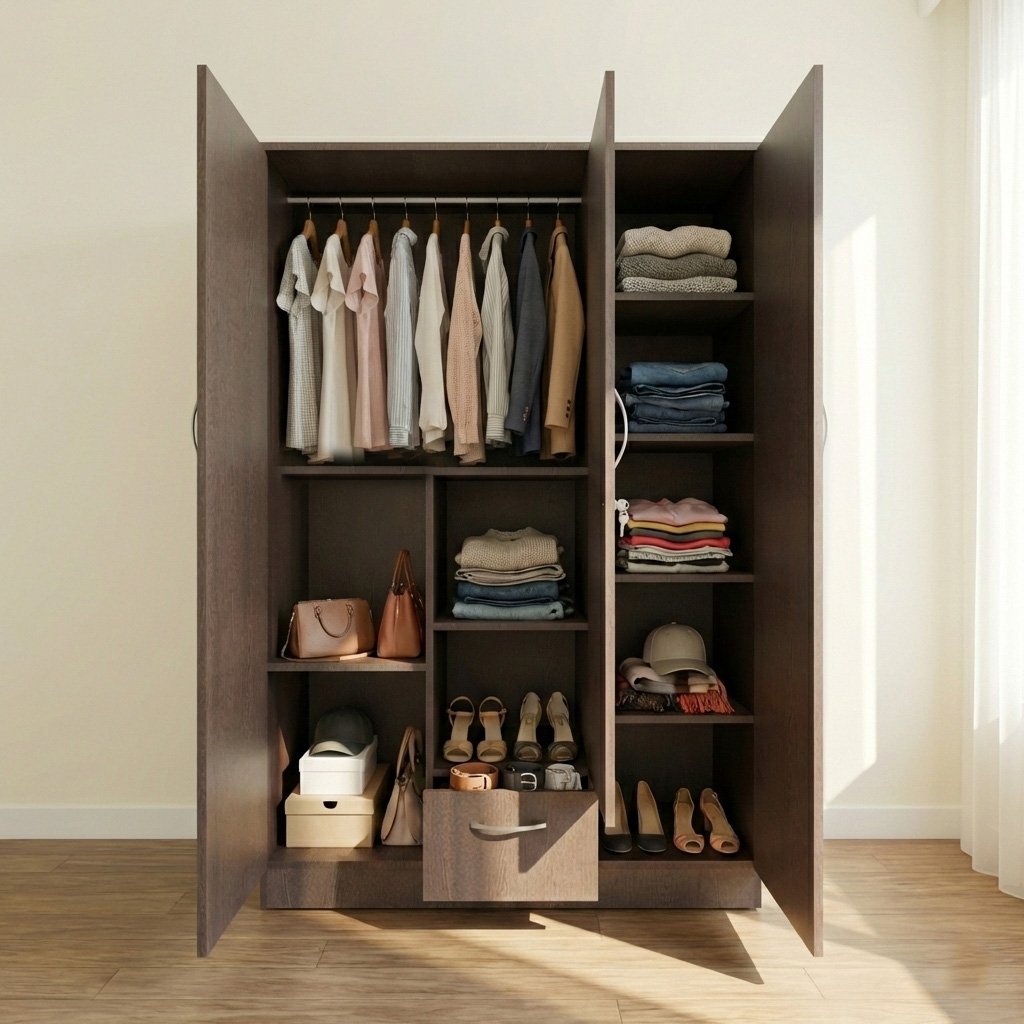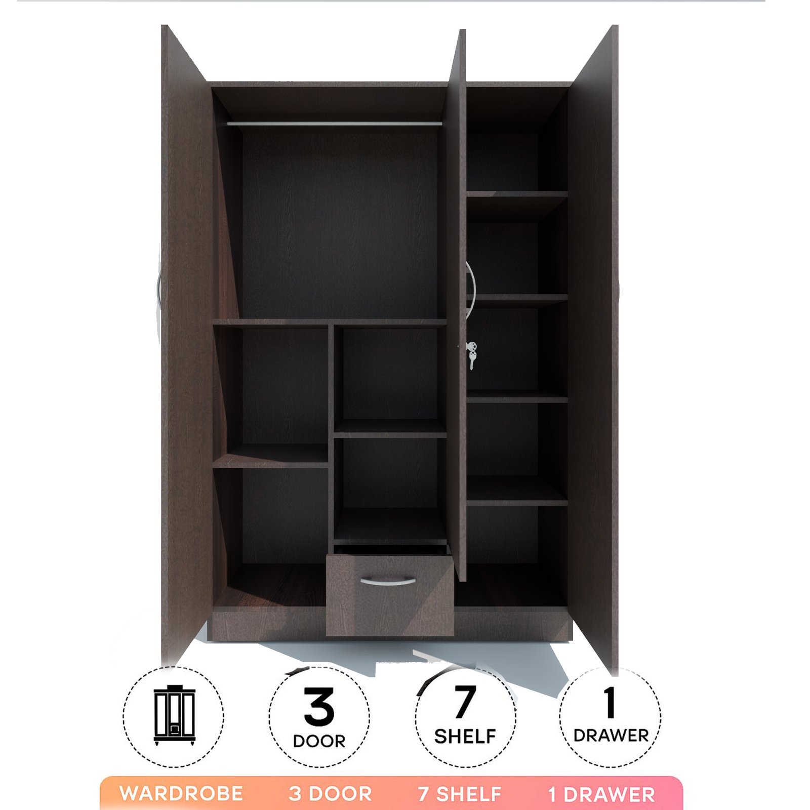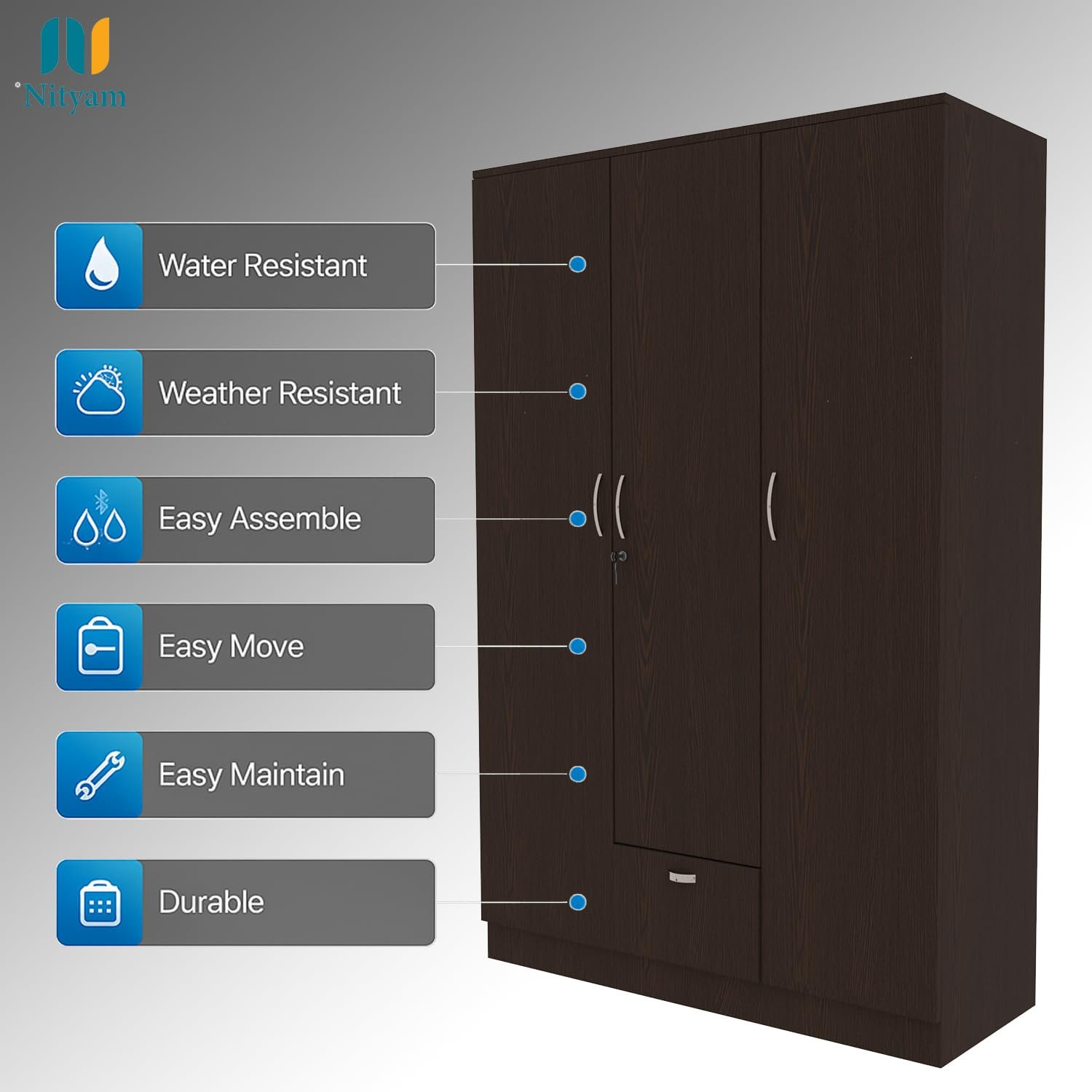 - ✅ Spacious Wooden Wardrobe Organizer: NITYAM Engineered Wood 3 Door wooden Wardrobe / Cupboards / Almirah organizer for storage features 7 Shelves, 1 Locker, & 3 Door, a hinged door and a secure key lock.